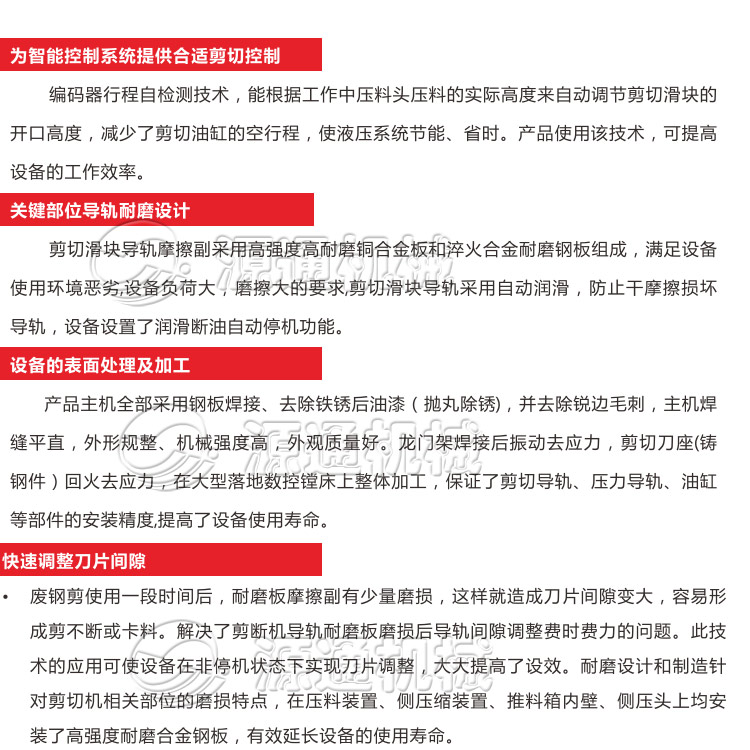 多刀液壓廢鋼剪切機適用用于金屬回收加工廠,報廢汽車拆解場,冶煉鑄造行業等, 對各種形狀的型鋼及各種金屬結構件進行冷態剪斷,加工成合格爐料。我們公司專利產品 多刀液壓龍門剪可以根據用戶的實際需求和要求,有針對性的去單獨設計一套專屬的液壓剪切機設備,常用型號:400、500、630、800、1000、1250噸多刀剪切機、可以一刀三段、 一刀五段,更好的提高使用效率。多刀片(多頭)設計,剪切塊度小精準度高整齊統一,避免二次剪切。源通重工多刀龍門剪采用推料箱送料,料箱尺寸大,處理料型種類多,且安裝有耐磨層經久耐用。 系統采用德國西門子、日本三菱、法國施耐德等知名品牌,工作過程現實自動花化、安全可靠。人機交互界面,可視化剪切過程監控,操作簡便,省工省時。具有遙控操作遠程協助和故障診斷功能,使用靈活方便。工作效率高,安全性高、且大大低勞動強度和人 工成本。